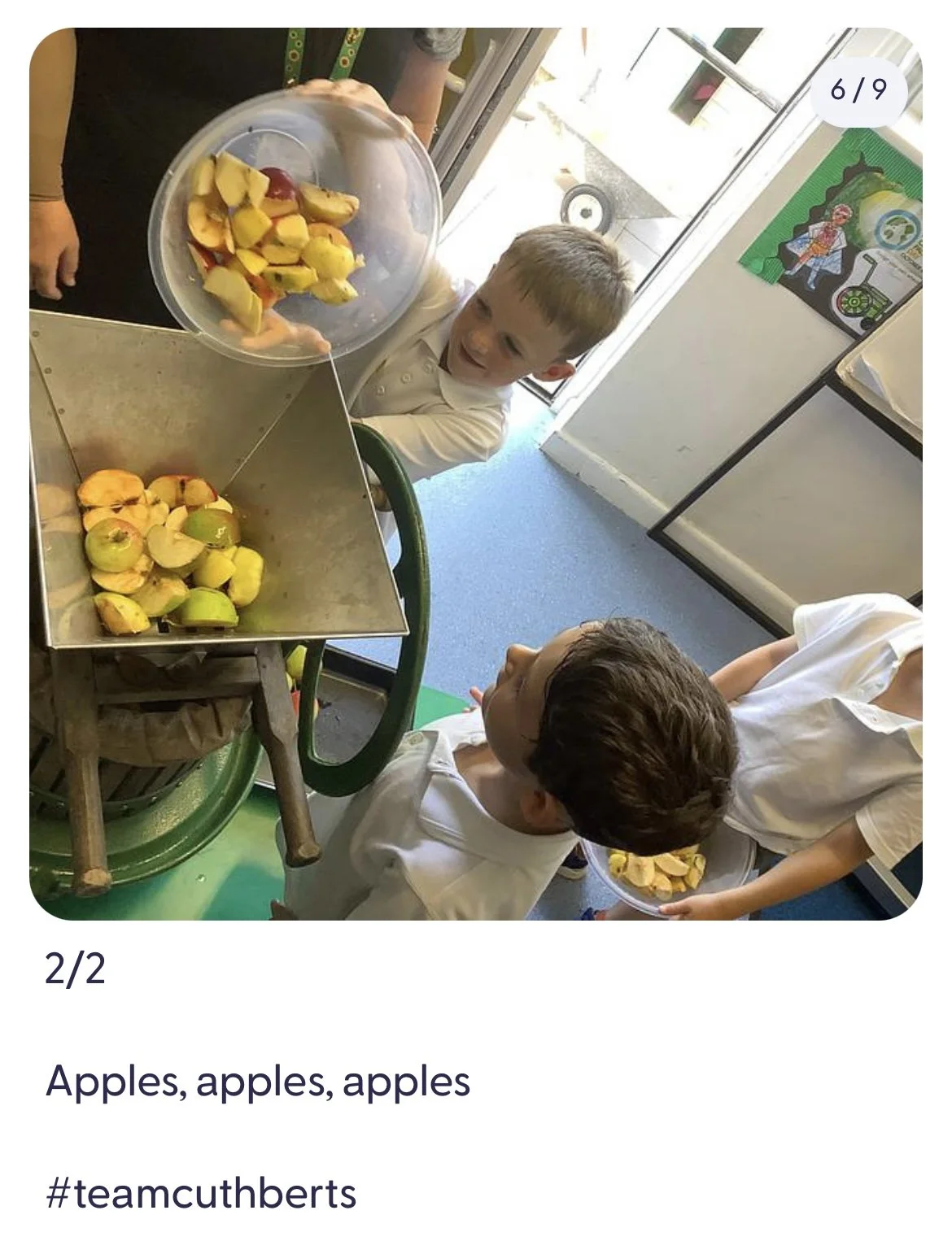 below: The children loved chopping, pressing and squeezing their apples. Of course they also enjoyed drinking the delicious apple juice too…
