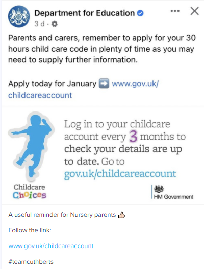 For information about applying for 30 hours free entitlement, please enquire via the school office for details.