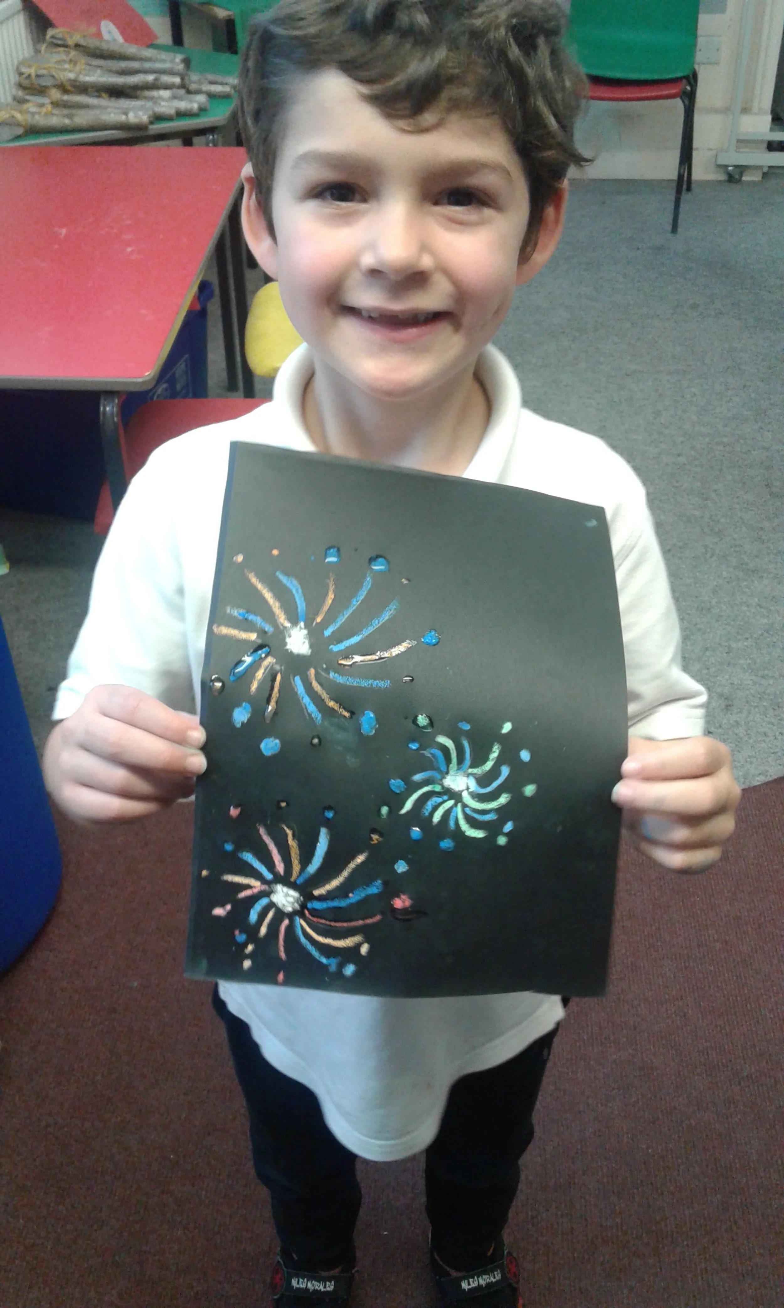above: We love it when the older children come through and help us in class. On Friday, after listening to PCSO Sarah Blacow all about staying safe on Bonfire night, we made our own sparklers and firework pictures…